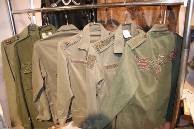 使い込んだ風合いのある、色あせたカーキ色の軍服に、ハードなスタッズやゴージャスなラインストーンなどをプラスして、単なるミリタリー物とは違うミックス感覚がに特徴があります。