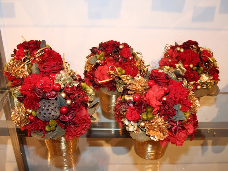 プリザーブドフラワー(Preserved Flower)ってご存知ですか?生花の持つ水分を、プリザーブド液という液体に入れ替えることによって、瑞々しさと柔らかさを保つ、一種の観葉植物です。水を与える必要がない上、生花より軽く、生花のような美しい色のバリエーションが長期間(1~2年ぐらい持つ!)楽しめるというもの。生花とドライフラワーの両方の良さを兼ね備えた画期的なお花はクリスマスギフトとしてインパクト大です。