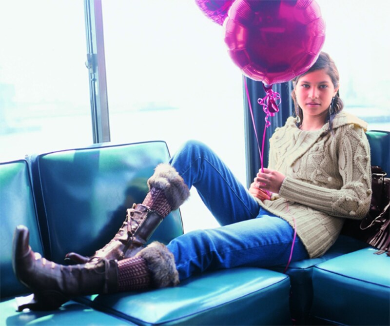 | ケーブル編みニット ¥8,295 ラビットファー付きデニム ¥10,395 レースアップブーツ ¥13,545 フリンジレザーバッグ ¥16,695 |