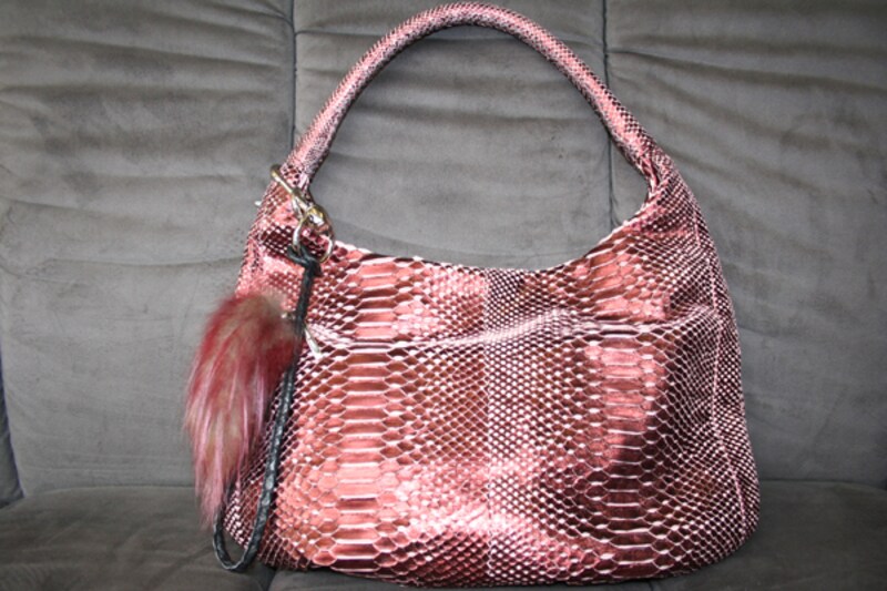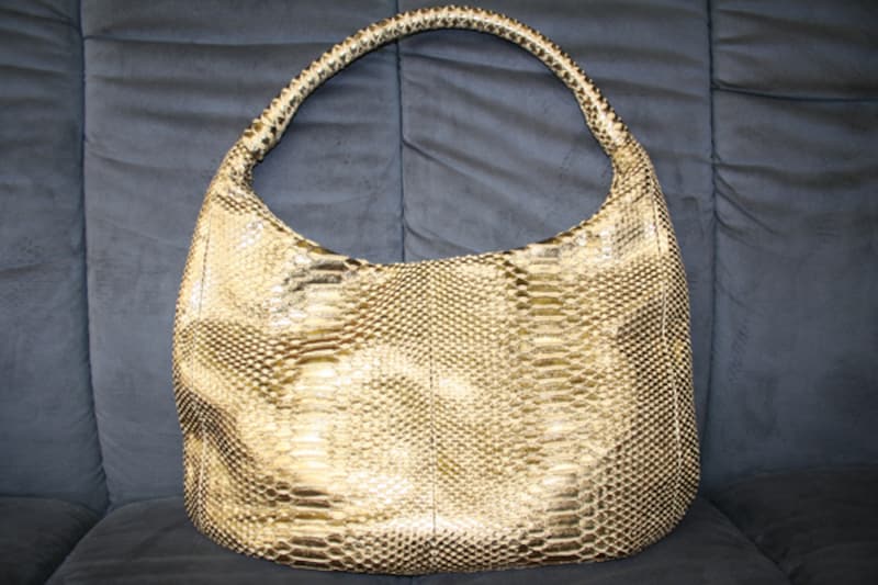 一度見たら忘れられない、ビジュアルインパクトが強烈なバッグです。リッチなパイソンの素材にゴージャスなメタリックカラーというパンチの効いた取り合わせに新鮮な驚きを覚えます。
