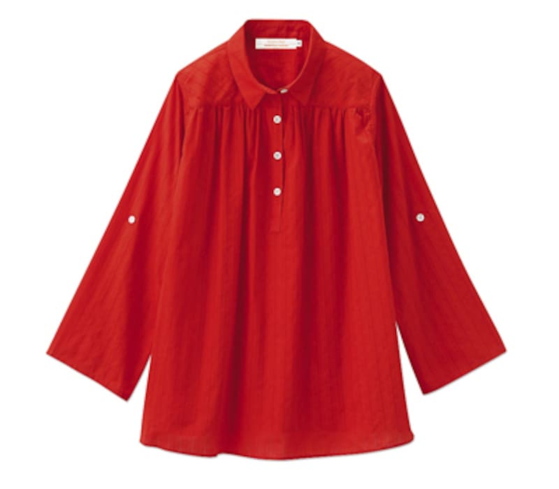 鮮烈な朱赤がダイナミックなプルオーバーシャツ。スモック風のふんわりボリュームシルエットがキュート。ざっくり着てもよし、ベルトでマークしたり、変幻自在のマルチフォルムが楽しい。袖部分のロールアップ仕上げもノスタルジック。