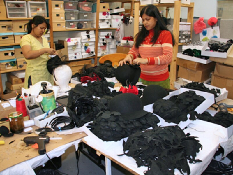 | アトリエには帽子の型がズラリ並ぶ。 | 職人さんがひとつひとつ帽子の型を作っていきます。 |