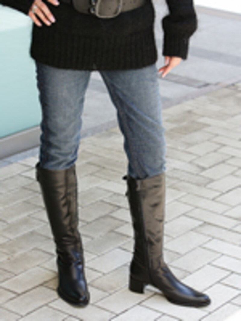 スリムタイプだと、ブーツカットよりも「腿のボリューム」が目立つのは事実。そこで、シルエットに慣れるためにも、ロングブーツと組み合わせて。