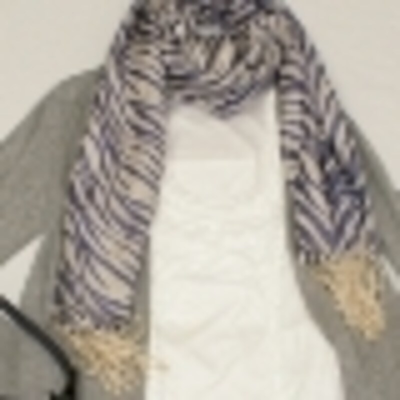 ゼブラ柄のストールは、ラベンダーよりの紫が使われることで柔らかい印象に。地は光沢のあるベージュに近いカラーなので、紫が苦手なイエローベースの顔色の方でも似合いやすいのが優秀ポイント。バッグはアンティーク調レザーの風合いで、クラシックな匂いのするパープルが楽しめます。ロングカーデとパンツというシンプルなスタイリングも、パープルの小物さえあれば今年顔に変身!
