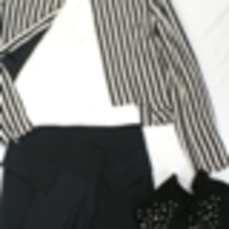 ZARAの一押しは、前を留めないタイプのジャケット。コンパクトな作りなのでどんなアイテムにも合わせやすいのはもちろん、さらっと羽織れるこなれ感も魅力です。ストライプ柄とスカートの構築的なデザインで、モノトーンでも動きのあるコーディネートに。