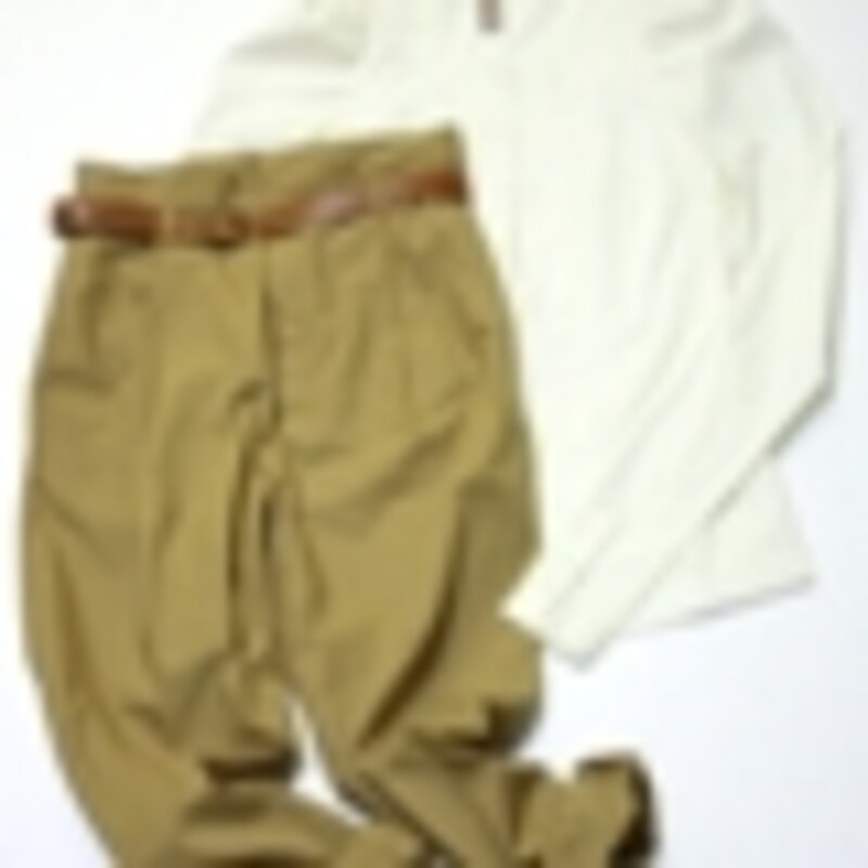 たとえば、パフスリーブのブラウスとタック入りのチノのパンツというこんなコーディネート。ともにH&Mのアイテムです。立体感のあるデザインのものを選ぶことで、それぞれが存在感を放ち、安く見せない着こなしに。