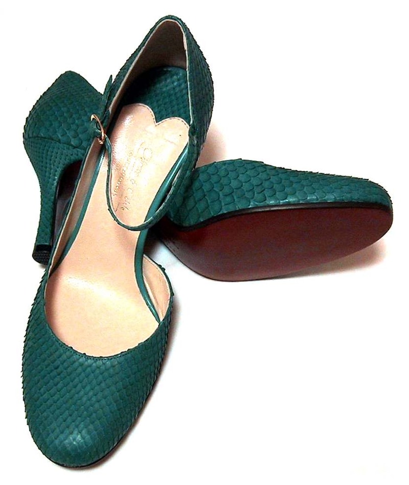 フェイクではなく、リアルのパイソン(蛇革)素材を使用したパンプス。 深い、けれども渋くくすんではいない、クリアなトーンのブルー系のアッパーと赤のソールの配色が絶妙。 ヒールが高く、つま先の部分に丸みを帯びたラウンド トゥのデザインは今年注目されている。 |