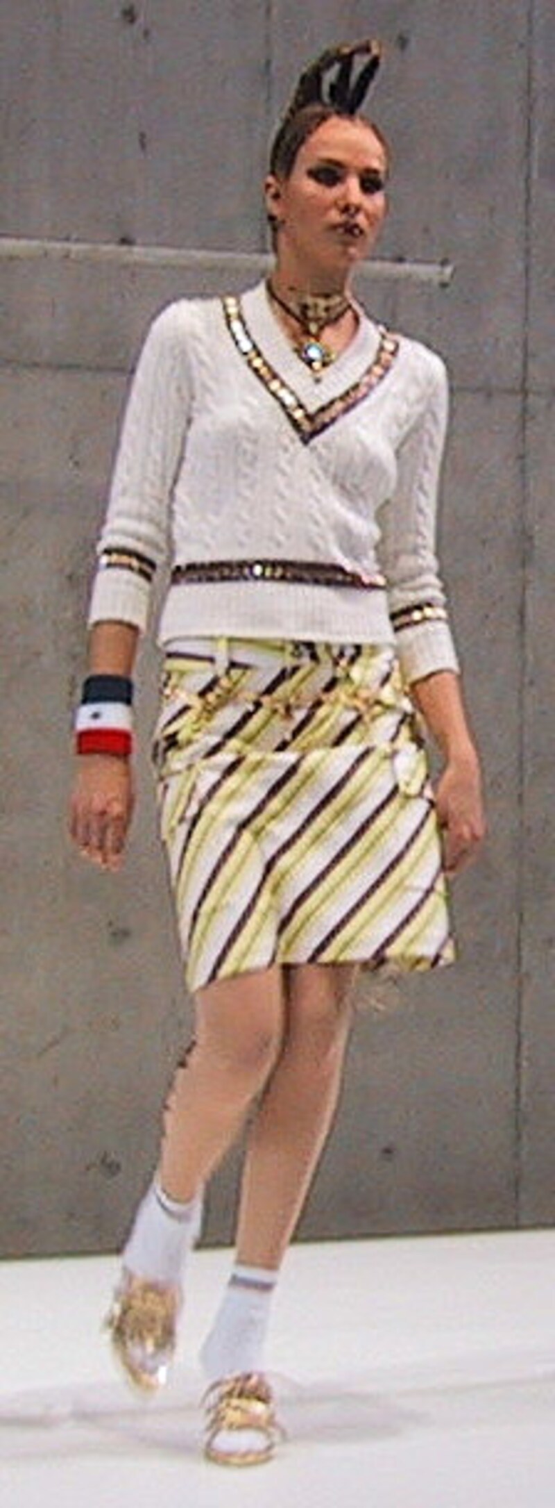 ケーブル編みのニットとバイアスストライプのスカート、スポーティな雰囲気のアイテムも、袖口やネックのラインにビーズの飾りが施されることで、美感と質感を高めている。 スワロフスキーやビーズ、スパンコールなど、ラグジュアリーな感覚の”ヒカリ物”が非常に巧く使われている。