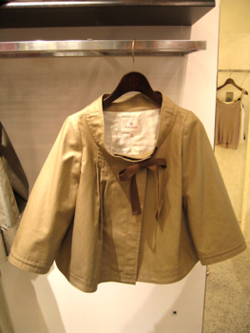 もう一つはテントラインのジャケット。大きく広がったカラーからお気に入りのインナーをアピールすることもできる、コーディネートの幅を広げてくれそうなジャケットです。大きなリボンが施されているものの、甘すぎないデザインなので通勤アウターとして簡単に取り入れることができます。