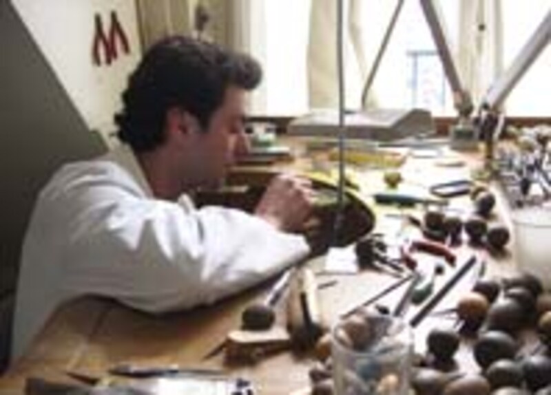 若い石留め職人。このポストに就くには、一通りのジュエリーの技法を身につけた後、10~15年の実績が必要なのだそう(日本と違って、かなり早い時期に職業訓練を始めるらしい)。 |