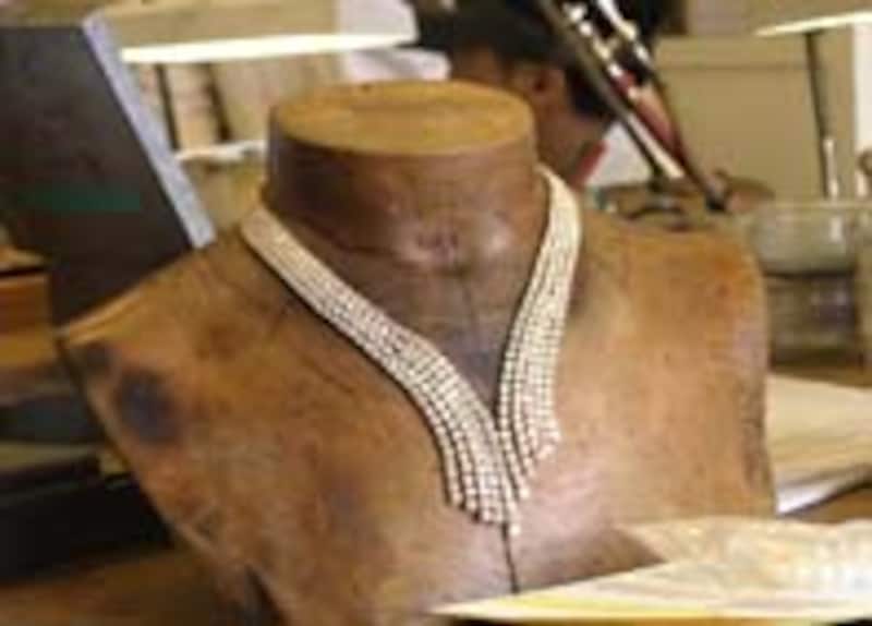 古い木のトルソにかけられた、カスケード・ネックレス。長さを調節するだけで、5カ月を要するとか。 |
