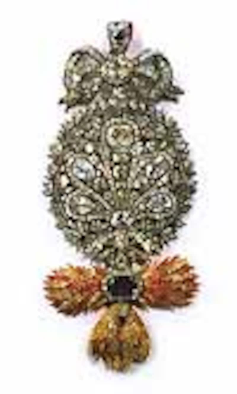 さらに、パリ展に続き話題となったのは、ポルトガル王家秘蔵の宝物の美しさ。1790年に作られた「金羊毛勲章(ゴールデン・フリース)」は、400個を超えるダイヤモンド、ルビー、サファイアでびっしりと飾られています。よく見ると、ぐったりした羊がたれ下がっているこの勲章は、金羊毛騎士団の長たるハプスブルク家のシンボルともいえるデザインで、ギリシャ神話に出てくる黄金の羊の毛皮がモチーフになっています。カルティエの名作ジュエリー「パンテール」のぐったりした豹のペンダントは、金羊毛勲章から想を得たものに違いありません。