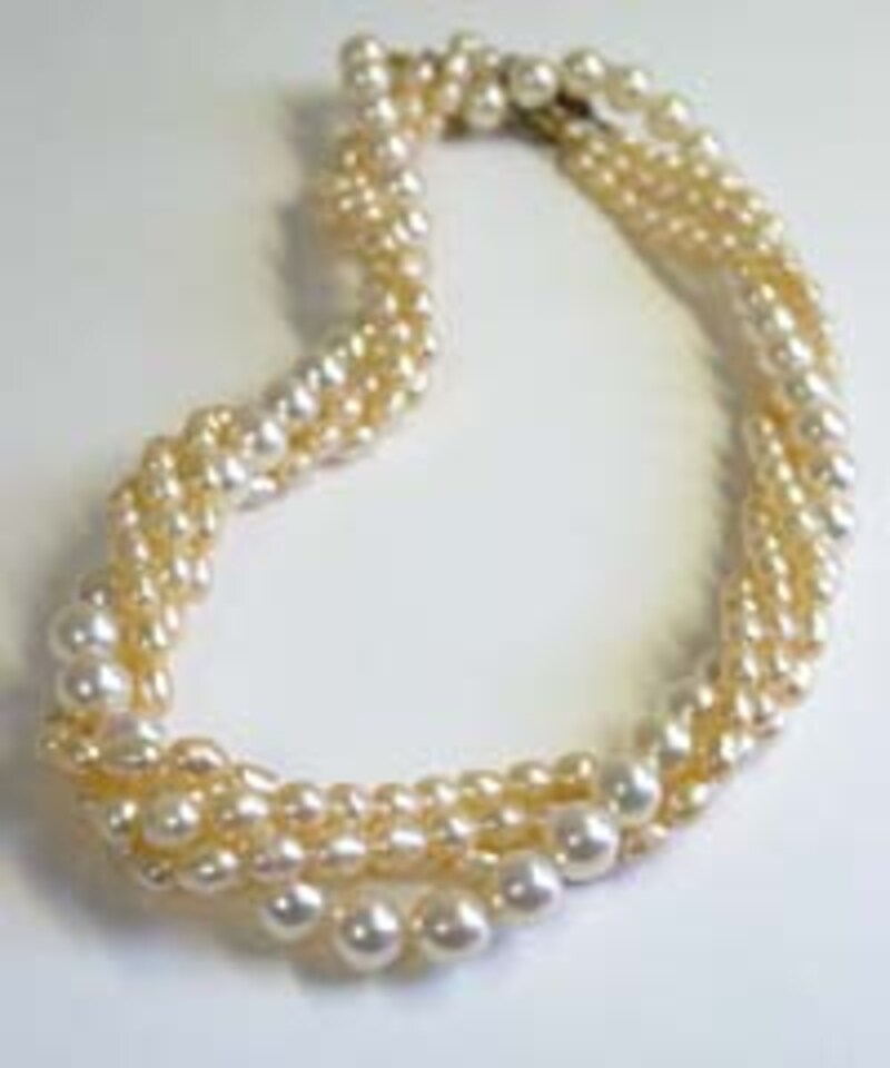 また、パールは真円に近く、表面にキズやエクボがなく、光沢(テリともいいます)が強いほど高価になります。前のページでご紹介した白蝶真珠のロングネックレスは、珠の形がゆがんでいたり表面にデコボコがあったりするので、真円に比べればはるかにリーズナブル。それでもやわらかな光沢がとてもきれいなので、満足度は十分です。いくら形が整っていても、艶がなかったらそれはまるでフェイクパールみたいなもの。選ぶなら、光沢のよい珠を優先するのがおすすめです。でも、ロングネックレスはバロックでもいいけれど、38~40cmの定番ネックレスを買うなら、光沢にも形やキズにもこだわって。キレイな珠のネックレスを1本持っていれば、それはもう一生ものなのですから。