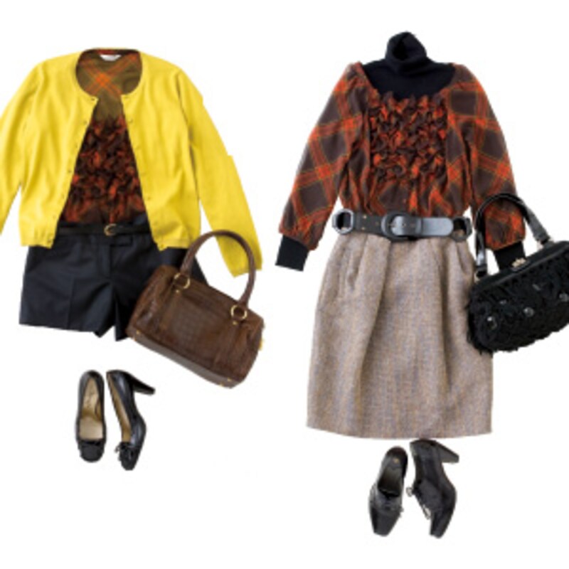 | 【左・初秋コーディネイト】イエローのカーディガンとショートパンツで、軽快なスポーツミックススタイルに。カーディガン 11,550円/メルローズ ショートパンツ 16,800円/joias ベルト 2,940円/オフオン(イトキン) バッグ 525,000円/アクセソワ(A・D・M・G) パンプス 19,470円(9月中旬発売予定)/銀座かねまつ(銀座かねまつ6丁目本店)【右・晩秋コーディネイト】タータルネックとツイードスカートを合わせて、フェミニントラッド。タートルニット 11,550円、ベルト 7,140円/MKミッシェル クラン(イトキン) ツイードスカート 15,750円/アナディス(アンシェヌマン ルミネ横浜店)バッグ 39,990円/LUANA(大磯産業 Tスクエア事業部) パンプス 18,690円/Fin |