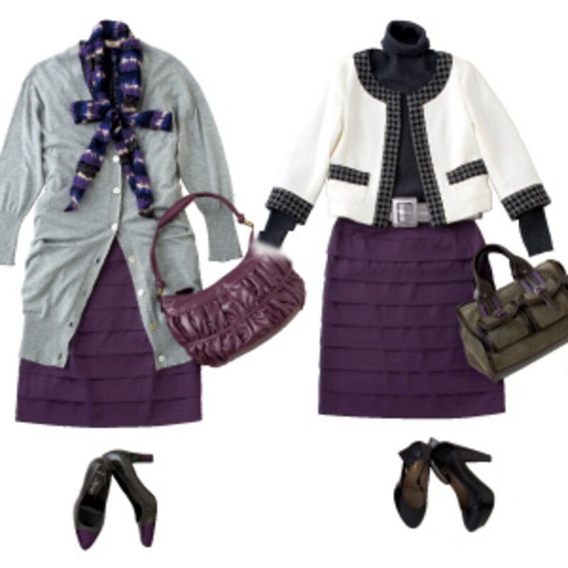 晩夏は、白のプリーツブラウスと合わせてエレガントに、初秋はロングカーディガンとでクールに、そして晩秋は、ツイードジャケットとタートルネックと合わせて正統派クラシックスタイルに挑戦。トレンドカラーのスカートを1枚持っていると、旬のスタイル作りにとても役立ちます。