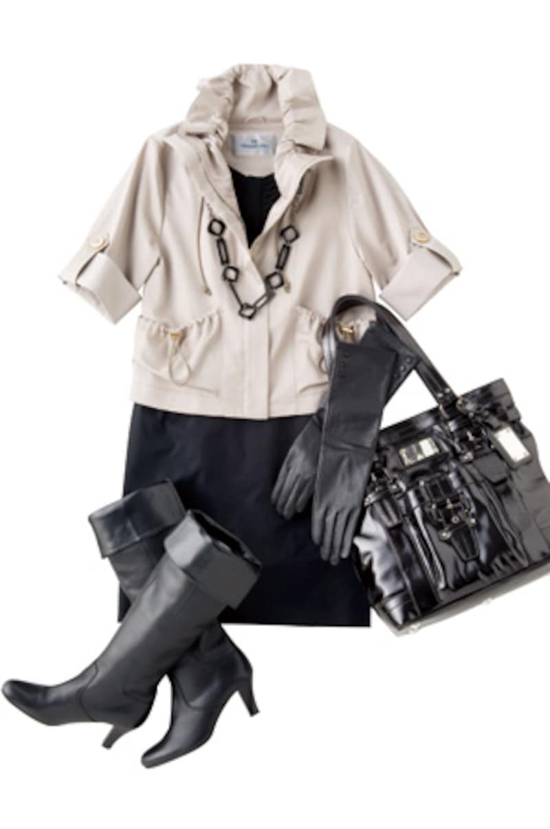 定番タイトスカートもニーハイブーツを合わせれば、旬の顔に。ブーツ 29,400円/ルージュ・ヴィフ(アバハウスインターナショナル)ジャケット 28,000円/Viaggio Blu キャミソール 9,345円/ア プライマリー(アキコオガワ デザインスタジオ) スカート 13,650円/ルーニィ グローブ 13,650円/joias ネックレ 6,195円/22オクトーブル(東京スタイル)バッグ 16,800円/J&R