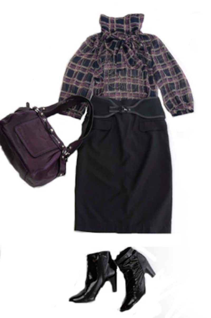 ボウタイブラウスにハイウエストスカート、こんなクラシックな装いは、ショートブーツでいい女風に仕上げて。黒エナメルショートブーツ 45,150円(8?)/シネラ(シブヤ西武 シューズメゾン) ベルト付きタイトスカート 14,700円/シネカノン(ストックマン) バッグ 44,100円/LUANA(大磯産業 Tスクエア事業部)