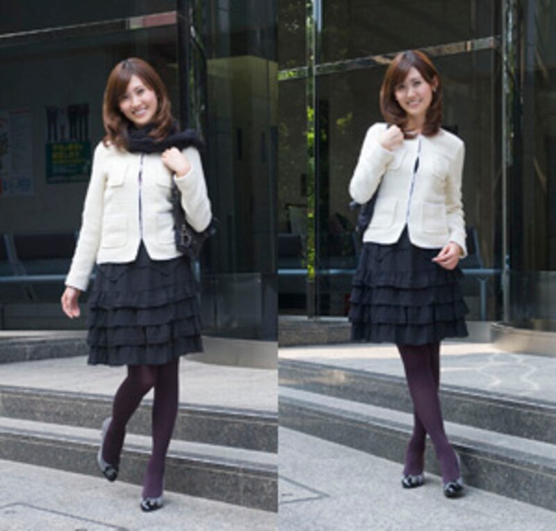 | 左が巻物あり、右が巻物なしスタイル。ジュエルチエンジズのツイードジャケットに、バネッサブリューのワンピースを合わせた甘めコーデ。黒のストールをプラスすることで、凛とした大人の魅力も加わります。(読者モデル 高木綾美さん) |