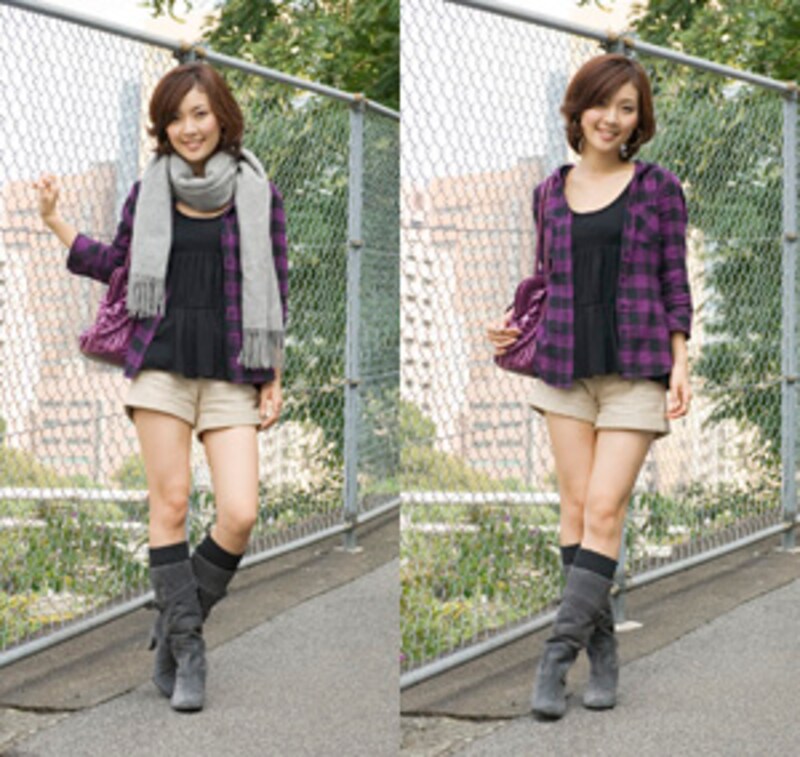 | 左が巻物あり、右が巻物なし。トレンドのチェック柄アウターにFREE’S SHOPのショートパンツを合わせたボーイズ風スタイル。グレーの巻物をあしらうことにより、洗練された大人めカジュアルスタイルに。(読者モデル 小川りか子さん) |