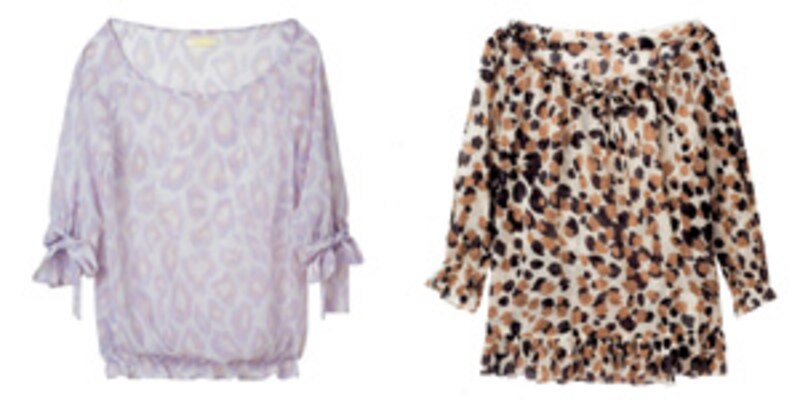 | 左 リボン&フリルの甘系ディテールが加わったレオパード柄ブラウス 13,650円/トータリテ 右 ラベンダー色のアニマル柄ブラウス 11,970円/snidelマルイジャム渋谷店 |