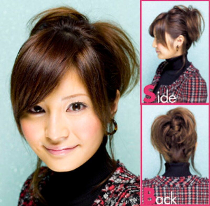 作り方は、まずトップ、両サイド、バッグに分けて。バッグの髪を中央でゴムで結び、サイドの髪をゴム部分にまいてピン留め。同様にトップの髪もゴム部分に巻き、毛先を逃がしてピンで留めます。毛先が後ろにダレないように、ゴム部分を前に倒してピンで留め、毛先をバランスよく散らしたら完成。