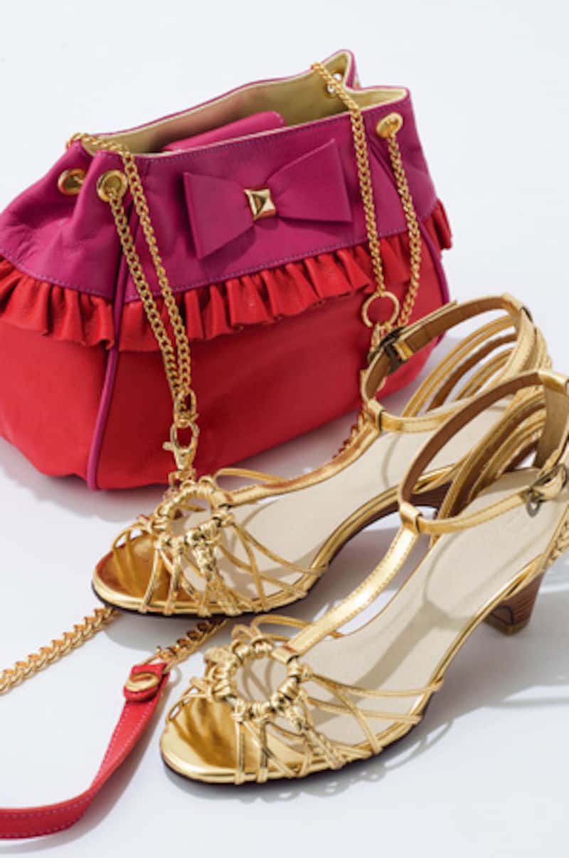 | ワンピースにリボンモチーフのバッグで女の子らしさを思い切りアピール、足元を大人めにまとめると、洗練されたフェミニンな装いが完成。チェーンをはずしてクラッチとしても持てるリボンバッグ(縦14×横29×マチ6?)11,550円/ストラ ゴールドのラインストーン付きサンダル(9?ヒール)15,750円、ゴールドのネックレス 3,675円/ともにLuxjewel サーモンピンクのワンピース 25,200円/ルーニィ |