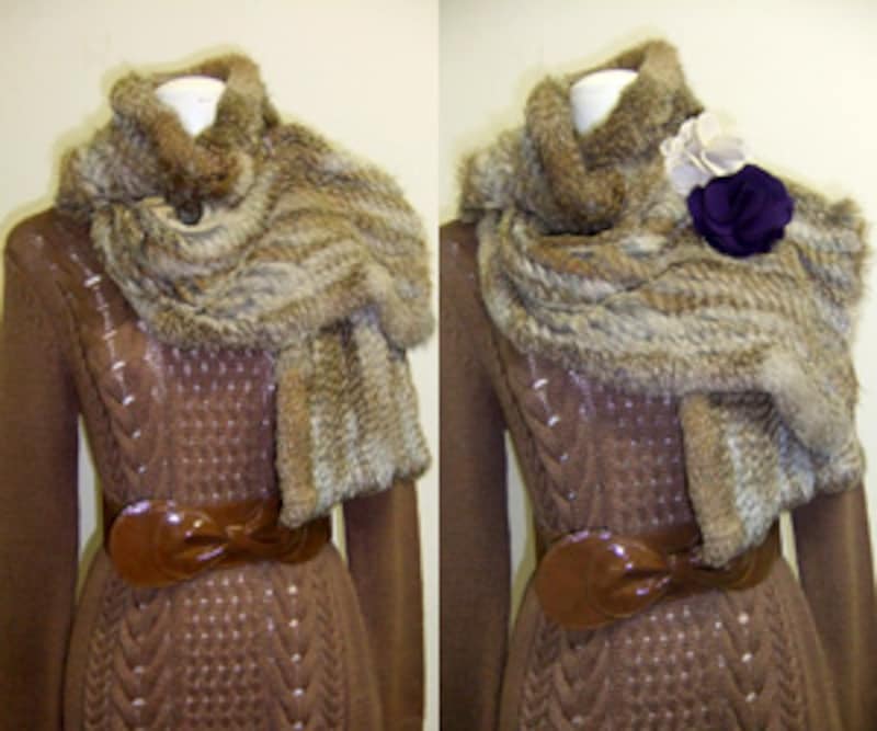 写真下の巻き方は、やはり千鳥格子の巻き方の右下の画像の巻き方と同じです。ファーの場合、布帛に比べてボリュームが出てしまうので、ストールの長さはやや短めのものの方が品良くまとまります。また、写真左下は、同じ巻き方にコサージを添えたもの。今季は、こんな風にアクサをプラスするアレンジも旬です。