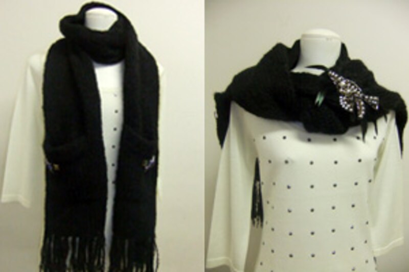 さて、このマフラー、襟元にひと巻きして両端を前にたらすと、見事なまでにシャープな縦ラインが生まれ、スリムに見せてくれます。さらに襟元でひと巻きしたり、ブローチをプラスしたりと、アレンジを加えると印象が変わります。たとえば、襟元でふた巻きして、ストールに両端を後ろにたらし、オフタートル風にアレンジすると、今度はトップスの高い位置にポイントができ、身長を高く見せてくれます。