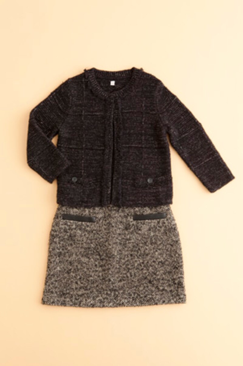 | ツイードのミニスカート(64?丈)は、ブーツとの相性抜群。上品なミックスツイードのジャケットニットジャケットと合わせれば、通勤にもおすすめ。ミックスツイードニットジャケット 2,990円、ツイードミニスカート 2,990円/ともにUNIQLO |