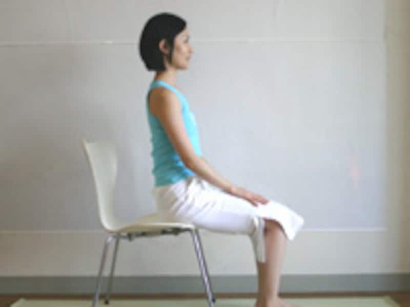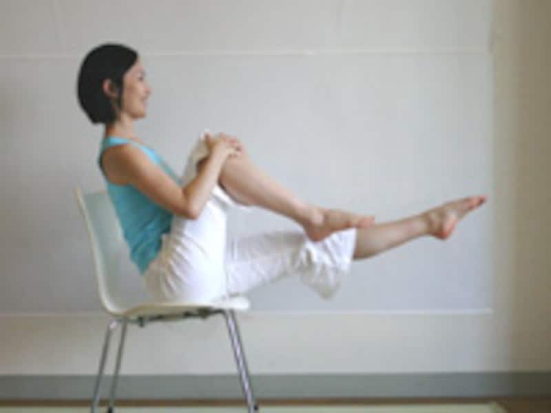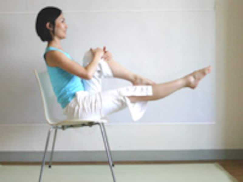イスがあれば、洋服のままできるピラティスです。いつでもどこでも、こまめに体を動かして美しさキープ!【シングル・レッグ・ストレッチ】(アレンジ)
