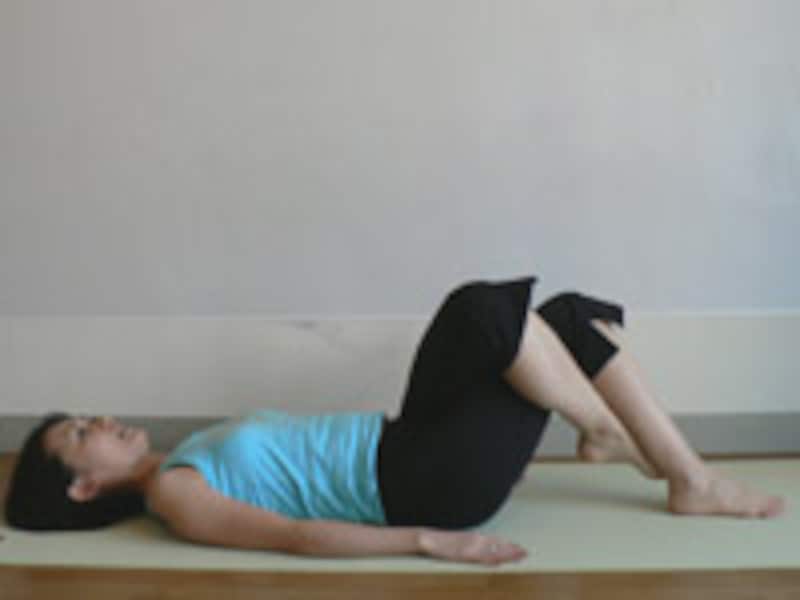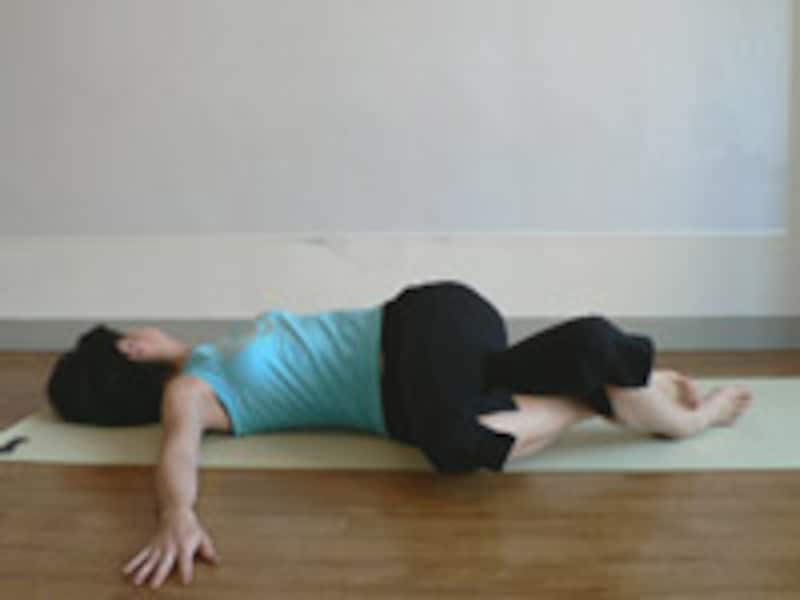 背中に疲れが溜まって、血流が悪くなると、どんどん背中に脂肪が溜まっていきます。まずは背中のコリをほぐしましょう。リラックス効果が得られる気持ちのいいヨガポーズです。【仰向けのねじりのポーズ】