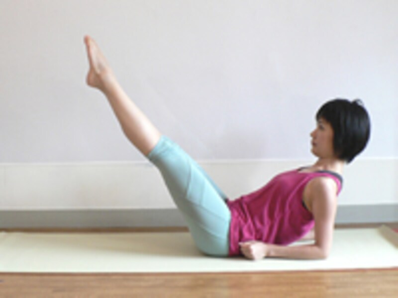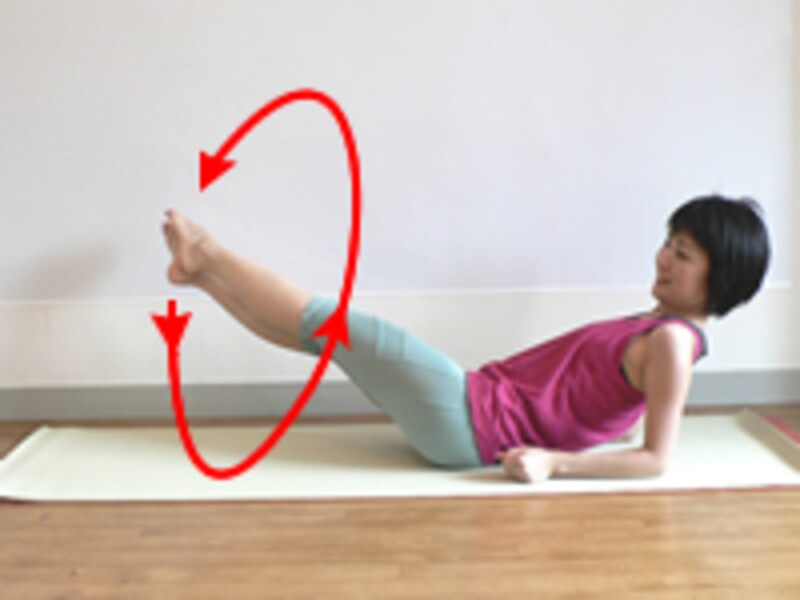 今回の『10分ピラティス』はかなりしんどいのですが、美と若さを保つには努力は不可欠!このページでは、わき腹を引き締める『ヒップサークル』にチャレンジです。両脚を動かす時はキレイなサークルを描きましょう。サークルが楕円やいびつな形にならないように気をつけて。