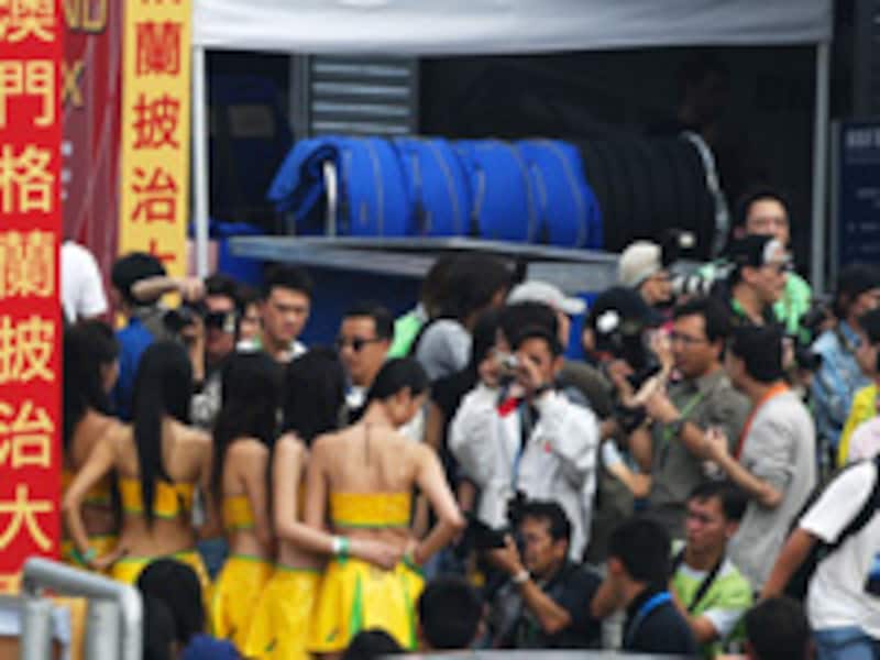 | レースクイーンに男たちが群がるのは世界共通?レースクイーンの数は予想以上に多く、目のやり場に困る。 (写真:Yoshi KITAOKA) |