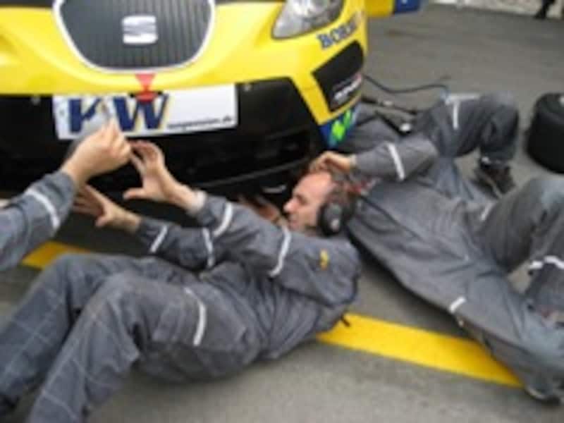 | 制限時間一杯まで使って必死になってマシンを修復するセアトのメカニック達。 |