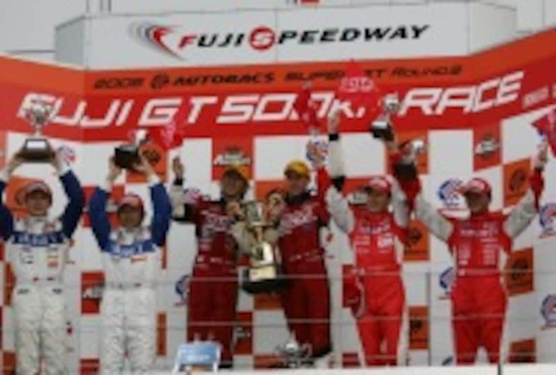 | Rd3富士500kmのGT500表彰台。3位は#23 XANAVI NISMO Z(本山哲/松田次生)が立っているが。。。 (写真提供:SUPER GT.net) |