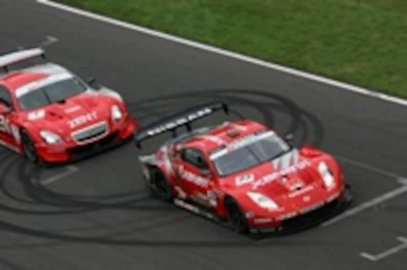 | テールトゥノーズのドッグファイトを展開するXANAVI NISMO Zの本山哲とZENTセルモSCの立川祐路。 (写真提供:SUPER GT.net) |