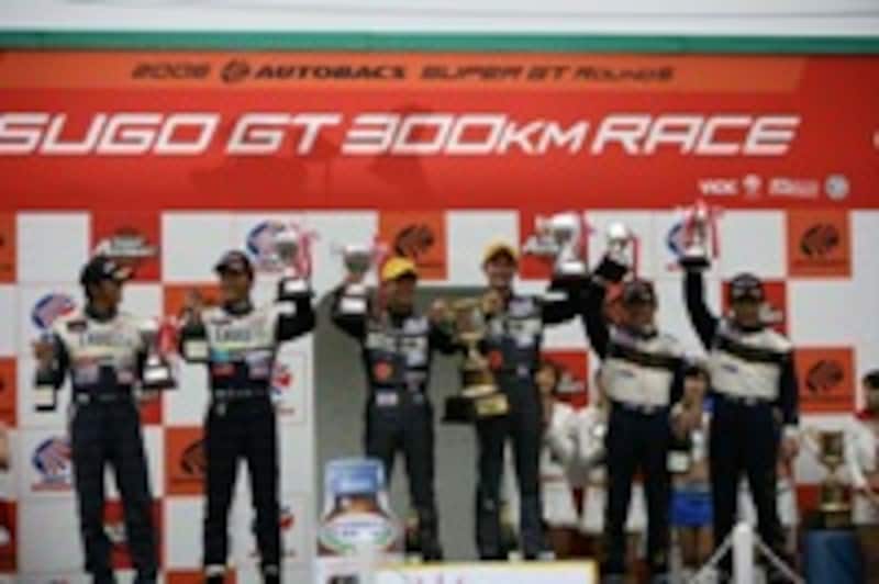 | GT300クラスの表彰台。大接戦で沸かしてくれた3台のドライバーには大きな拍手が送られた。 (写真提供:SUPER GT.net) |