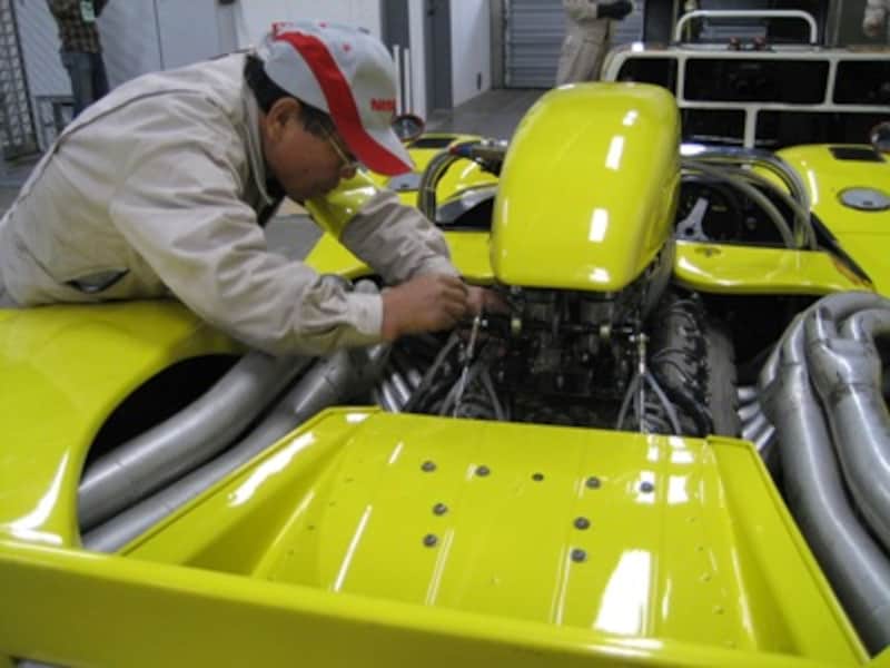| ニッサンR382を真剣な目つきでメンテナンスするメカニック。当時と変わらない「愛情」と「情熱」が古いレーシングカーのパワーを支える。 |