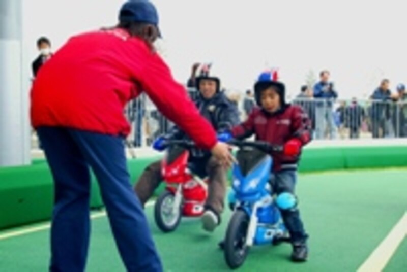 | 亀谷長純選手と理久くんがツーリングバイクに挑戦。ツーリングバイクは親子で一緒に楽しめる。 (写真提供:鈴鹿サーキット) |