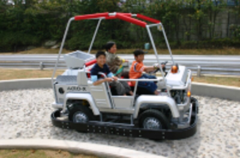 | ガタガタ道を行くアクロエックス。親子で乗って子供が操縦できる。 |
