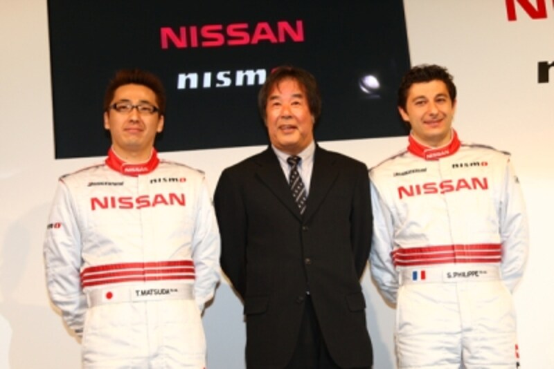 | 星野一義監督が率いるCALSONIC IMPUL GT-R 左から松田次生、星野監督、セバスチャン・フィリップ フォーミュラニッポン王者の松田はカルソニックのアタック役を担うことは確実。プライベーターながらチャンピオンの有力候補だ! |