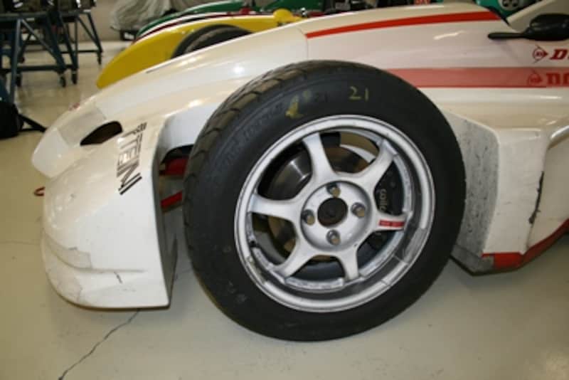 | タイヤはダンロップのワンメイクで、溝付きのラジアルタイヤを使用する。ちなみにタイヤは1セット20万円。ブレーキは4ポッドアルミキャリパーが採用され制動力の向上が図られた安心設計。 |