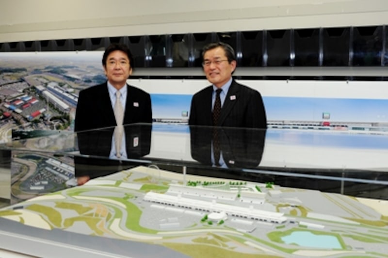 | 完成予想模型を前に語る株式会社モビリティランドの土橋哲取締役社長(左)と土屋一正取締役モータースポーツ担当(右) 【画像提供:MOBILITYLAND】 |
