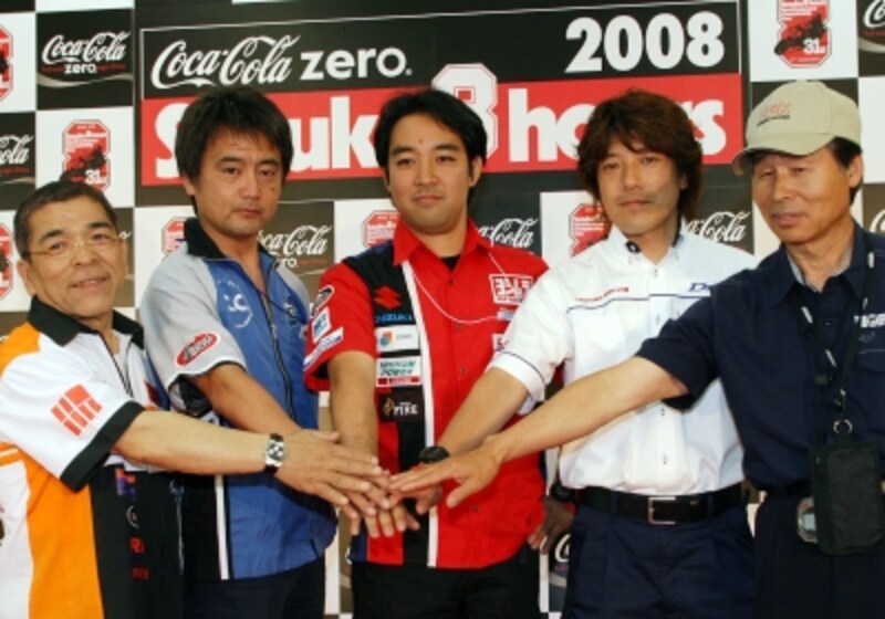 | 左からチームハルクプロの本田監督、TSRの藤井監督、ヨシムラの加藤監督、ホンダワークスチームの松原監督、そしてモリワキの森脇監督の5人 【写真提供:MOBILITYLAND】 |