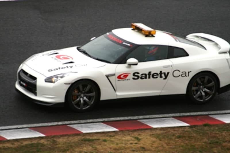 | SUPER GTで導入されている日産GT-Rのセーフティーカー 天井のランプが消えると「次の周にリスタート」の合図だ。 【写真:辻野ヒロシ】 |
