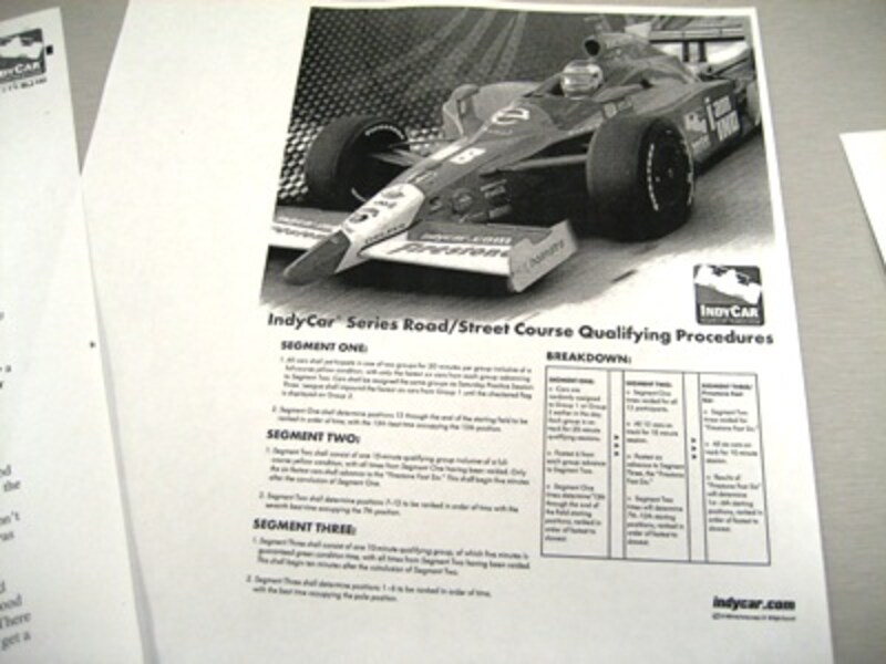 | ロードコース、ストリートコースで行われるノックアウト方式予選の進行を記した資料。こういった共通資料は分かりやすくて良い。さらにレース進行が分単位で記された細かい進行表が配られる。何時何分から国歌、戦闘機飛行、エンジンスタートなどと事細かに表示されており、これがあればカメラマンがシャッターチャンスを逃すことがないし、進行も円滑に進む。 【写真:辻野ヒロシ】 |