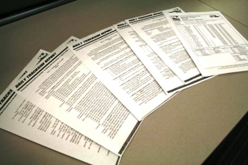 | メディアセンターで配布されるDAILY TRACKSIDE。1周ごとのレースの動向が事細かに文章化されてレポートされ、レースの途中も随時各デスクに配布される。 【写真:辻野ヒロシ】 |