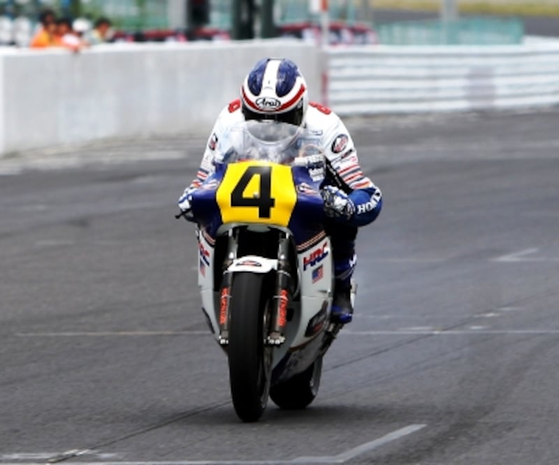| 1周のアタックを敢行したフレディ・スペンサー。 2ストローク500ccのグランプリマシンのサウンドは格別だった。 【写真提供:MOBILITYLAND】 |