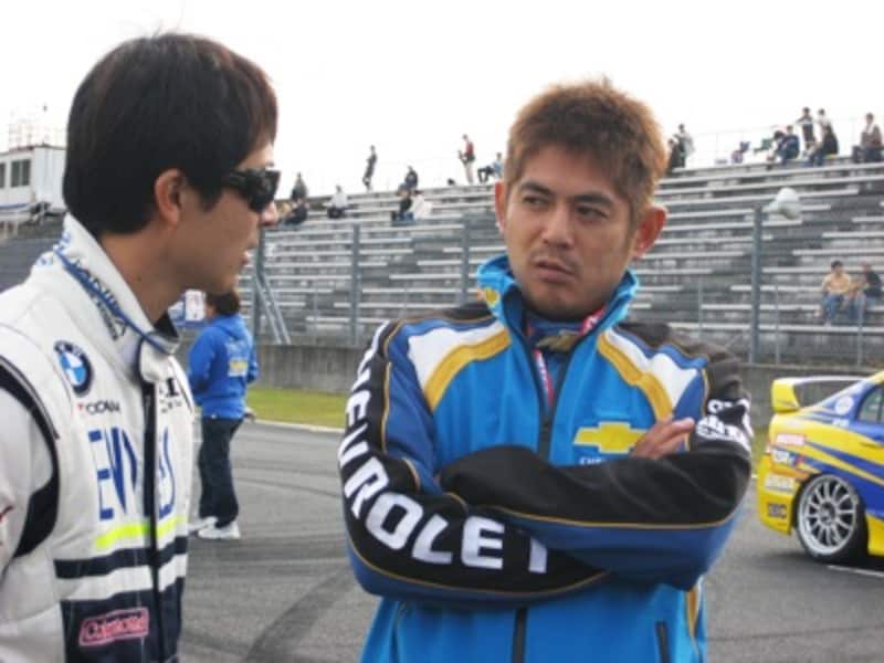 | BMWで参戦した青木孝行と話す織戸学。 |