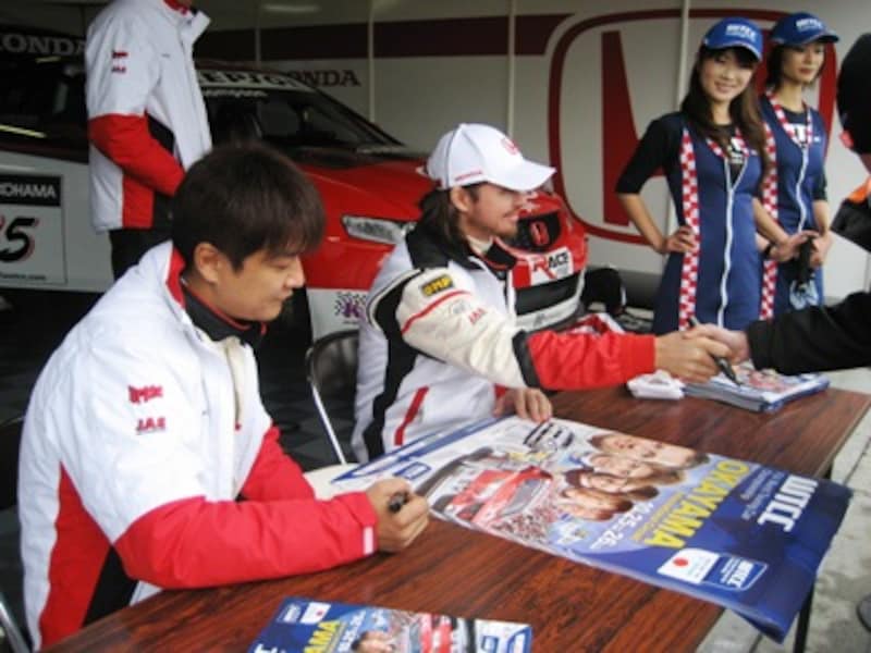 | ホンダのピットは大人気。谷口とトンプソンが長蛇の列を作ったファンにサインと握手を贈った。 |